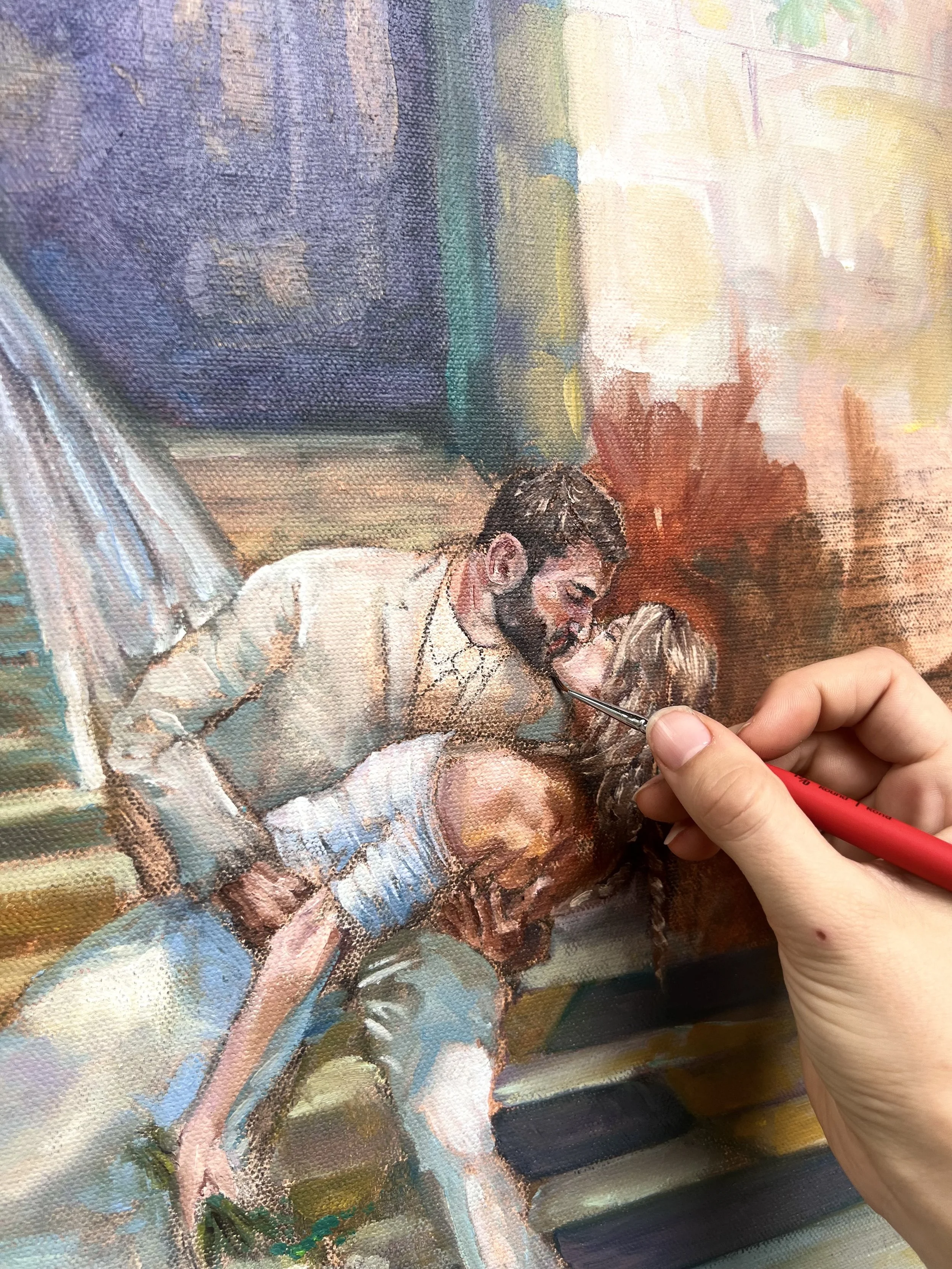 After the wedding, I'll refine the painting in my studio (adjusting, lighting, adding delicate details) to ensure it's perfect.