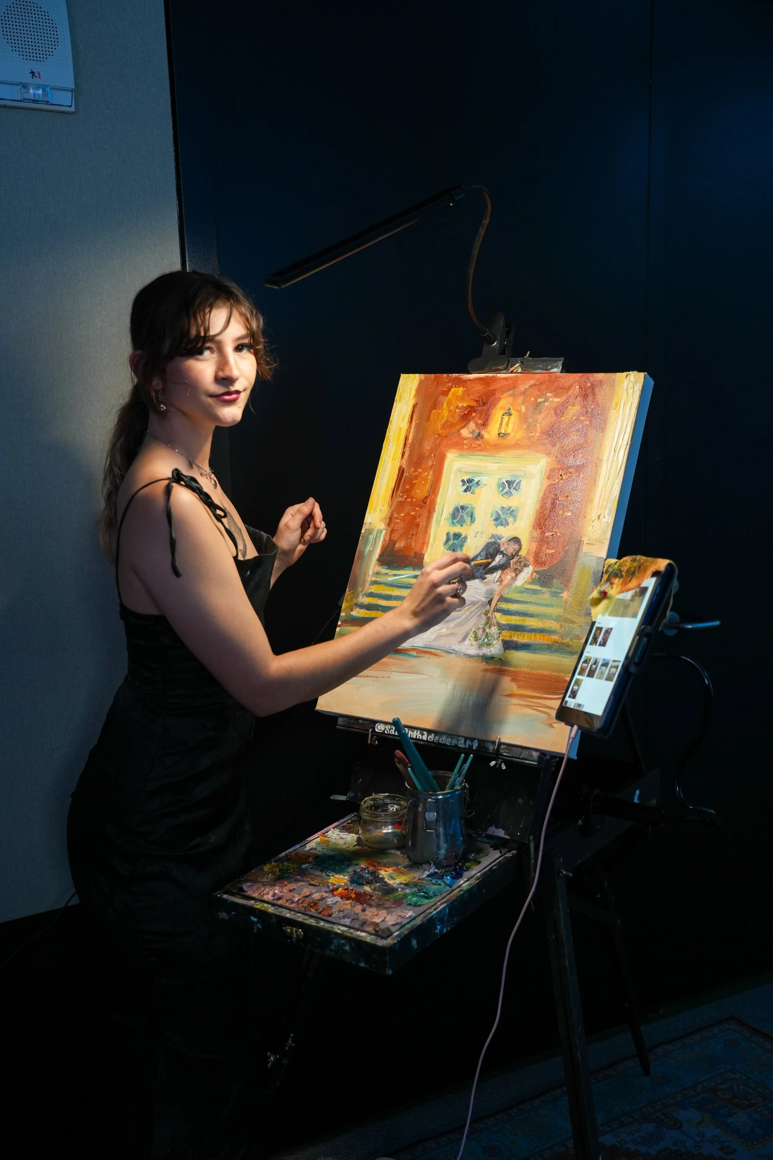 I'll arrive early to set up my easel discreetly at your venue. As the event unfolds, I'll live paint—guests often love watching the artwork progress!